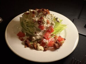 We then started with the wedge salad ($12.48), crisp and light. The blue cheese tasted like it was homemade. One of us is a big blue cheese fan and the other typically is not but we both found this to be delectable. It made for a nice combination with tomato and iceberg lettuce and crispy bacon — the seamless mix of a classic salad executed perfectly.