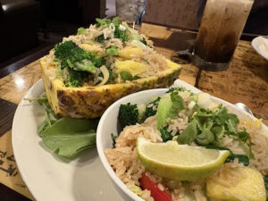 Yet, when ordering we hadn’t been able to resist trying the pineapple fried rice ($23), served, yes, inside half of a pineapple! We ordered ours with vegetables and mild spice, both decisions we later regretted. When the dish was served, it came out in the pineapple, with another large bowl full of the fried rice on the side as well. The rice was absolutely loaded with vegetables, mostly broccoli, bok choy and cabbage. While I appreciated the sentiment of bulking up the dish, the blend of veggies just didn’t really do anything for us. Plus, the seasoning was too mild or even non existent.
