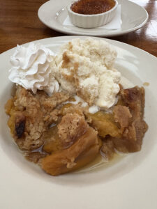 The peach crisp came with spiced peaches and large dollops of whipped cream and ice cream. It had a good flavor, but I could have stood to get a bit more of the crisp part. What we did get lost its texture and “crisp” to the peaches that dominated the dish.