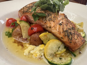 The tomatoes, zucchini and squash were also lightly buttered and delicious. Together, they all blended with the salmon for a beautiful dish.